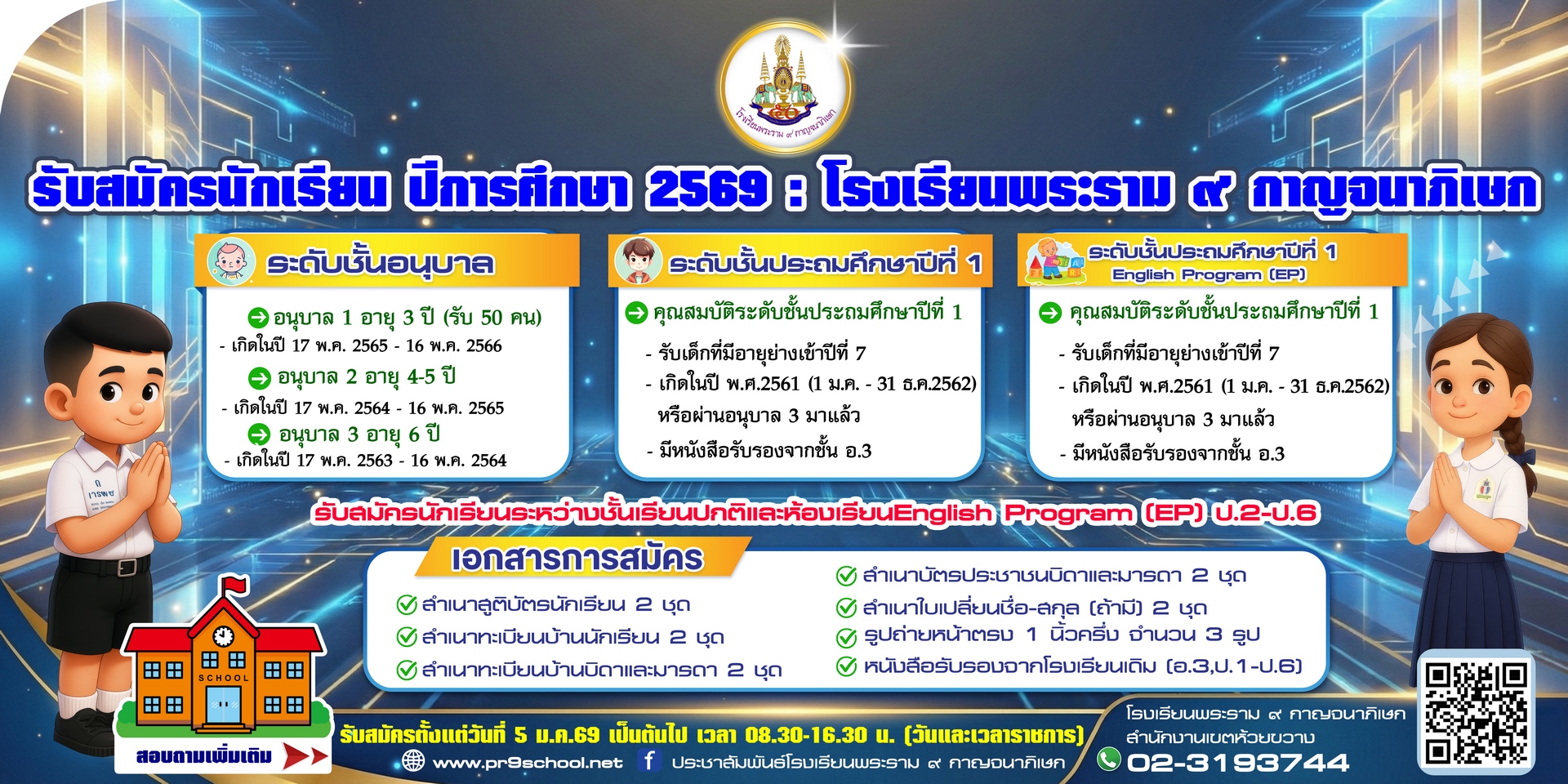 ยินดีต้อนรับเข้าสู่โรงเรียนพระราม ๙ กาญจนาภิเษก รับสมัครนักเรียนใหม่ ประจำปีการศึกษา 2569 ตั้งแต่บัดนี้เป็นต้นไป สนใจโทรสอบถามได้ที่ 02-3193744